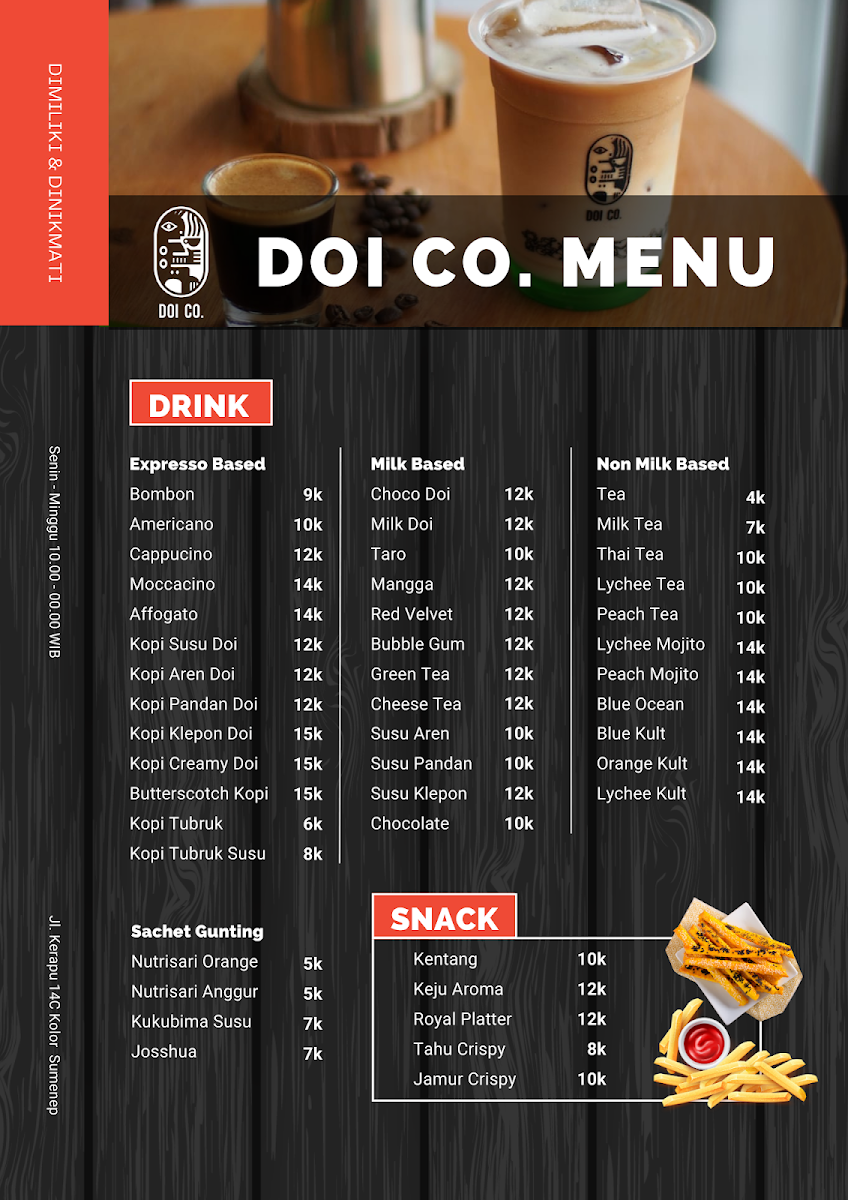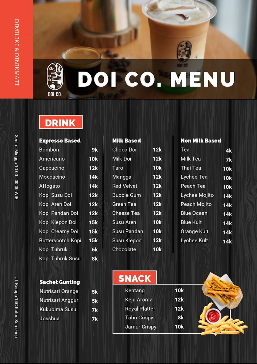 Nestled in the heart of Sumenep, East Java, Cafe DOI CO offers a cozy retreat for food enthusiasts and casual coffee drinkers alike. Patrons have praised the inviting atmosphere, making it an ideal spot for relaxation and social gatherings. The café's highlight is its delightful matcha beverages, which have garnered outstanding reviews from enthusiasts who swear it’s the best in the area.